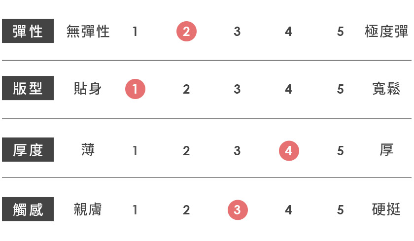 | 觸感 | 親膚 | 1 | 2 | 3 | 4 | 5 | 硬挺 |