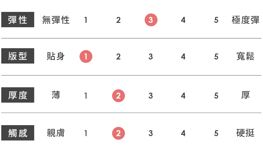 | 觸感 | 親膚 | 1 | 2 | 3 | 4 | 5 | 硬挺 |