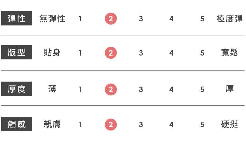 | 觸感 | 親膚 | 1 | 2 | 3 | 4 | 5 | 硬挺 |