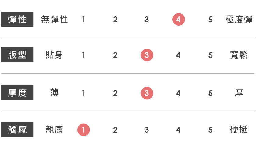 | 觸感 | 親膚 | 1 | 2 | 3 | 4 | 5 | 硬挺 |