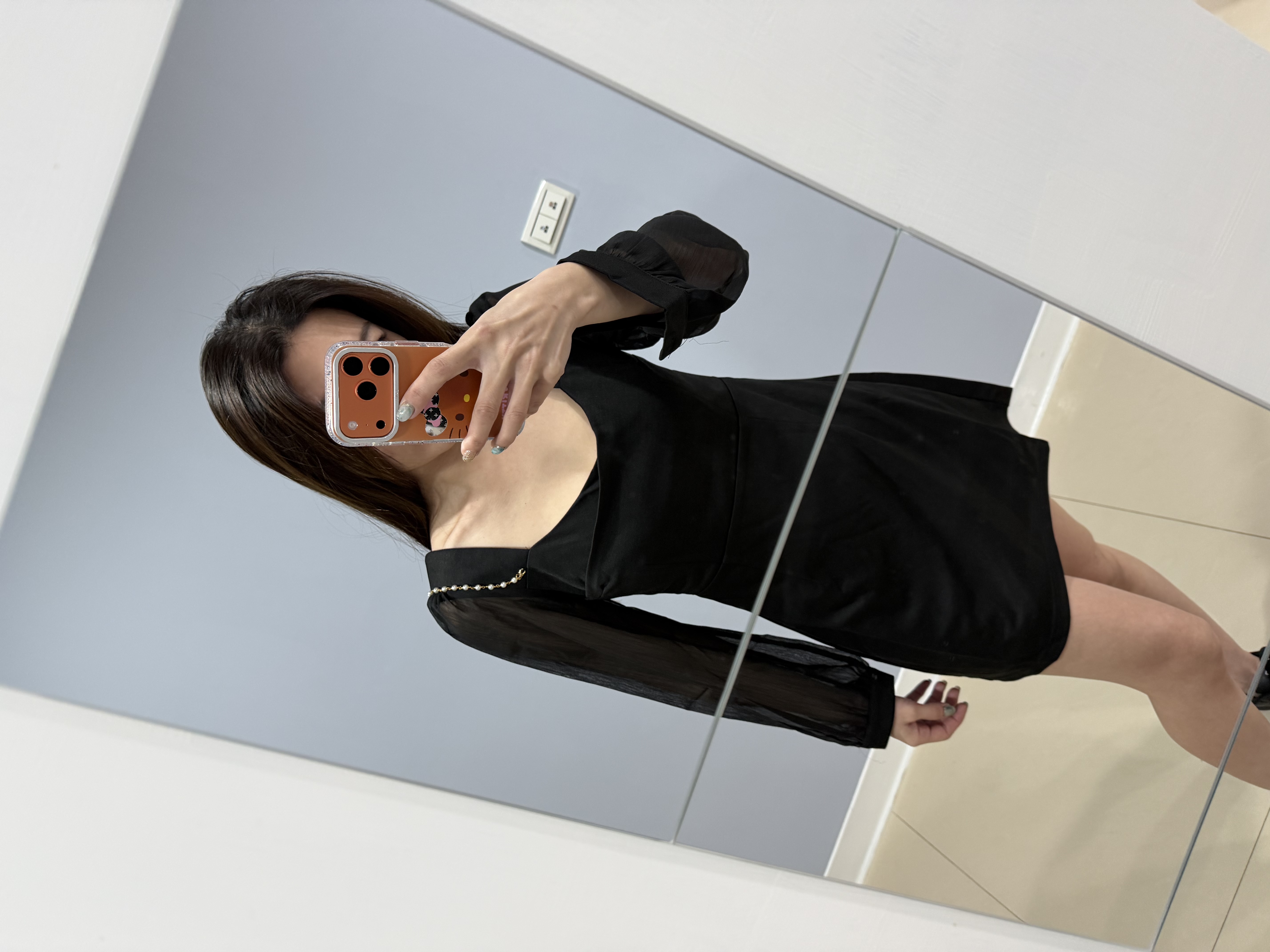 腰線還蠻高的 如果身材跟我依樣是算梨形身材的話應該買正常尺寸 珍珠鏈需再短一點 不然會一直掉到肩膀上