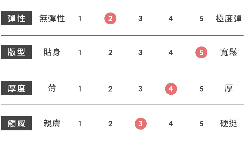 | 版型 | 貼身 | 1 | 2 | 3 | 4 | 5 | 寬鬆 |