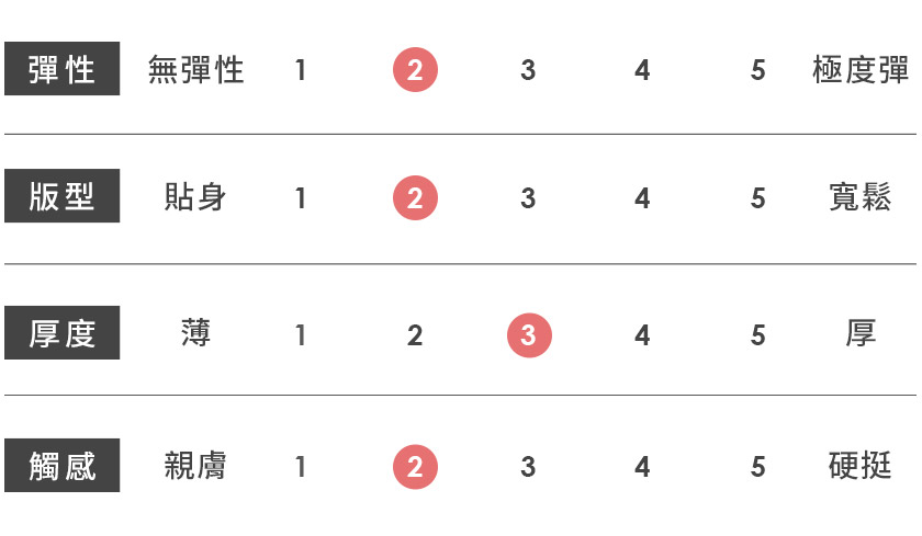 | 觸感 | 親膚 | 1 | 2 | 3 | 4 | 5 | 硬挺 |