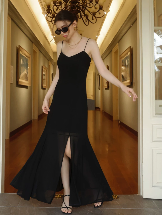 Satin Spaghetti Strap Padded Maxi Dress with Sheer Panel Flare Hem
