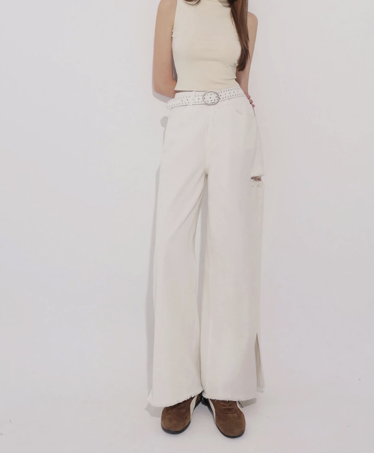 Frayed Hem Wide Leg Jeans Denim Pants with Distressed Detail