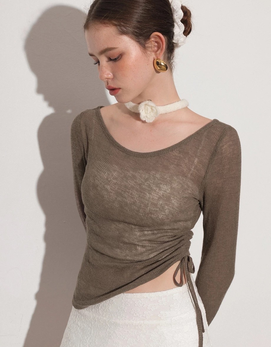 Sheer Knit Round Neck Long Sleeve Top with Adjustable Ruched Hem