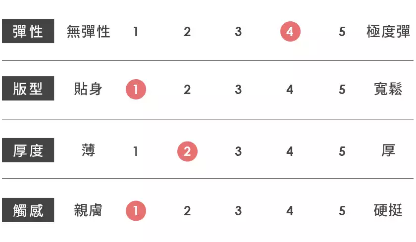 | 觸感 | 親膚 | 1 | 2 | 3 | 4 | 5 | 硬挺 |