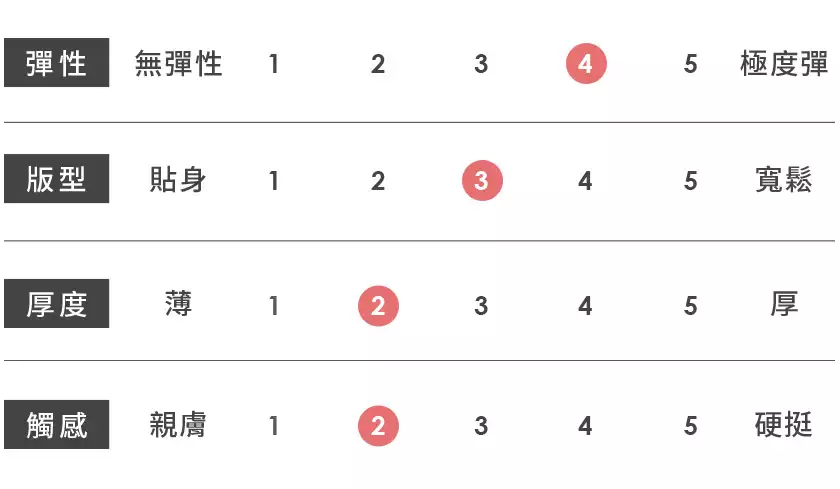 | 觸感 | 親膚 | 1 | 2 | 3 | 4 | 5 | 硬挺 |