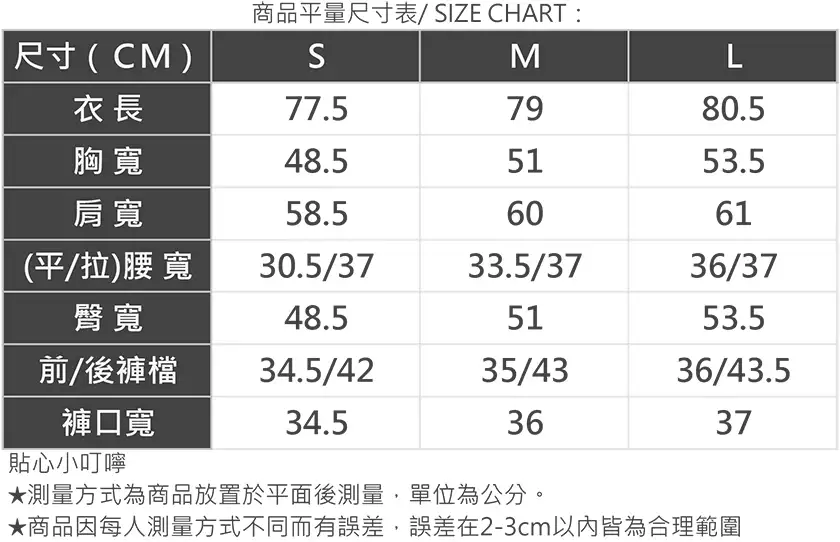 | 版型 | 貼身 | 1 | 2 | 3 | 4 | 5 | 寬鬆 |
