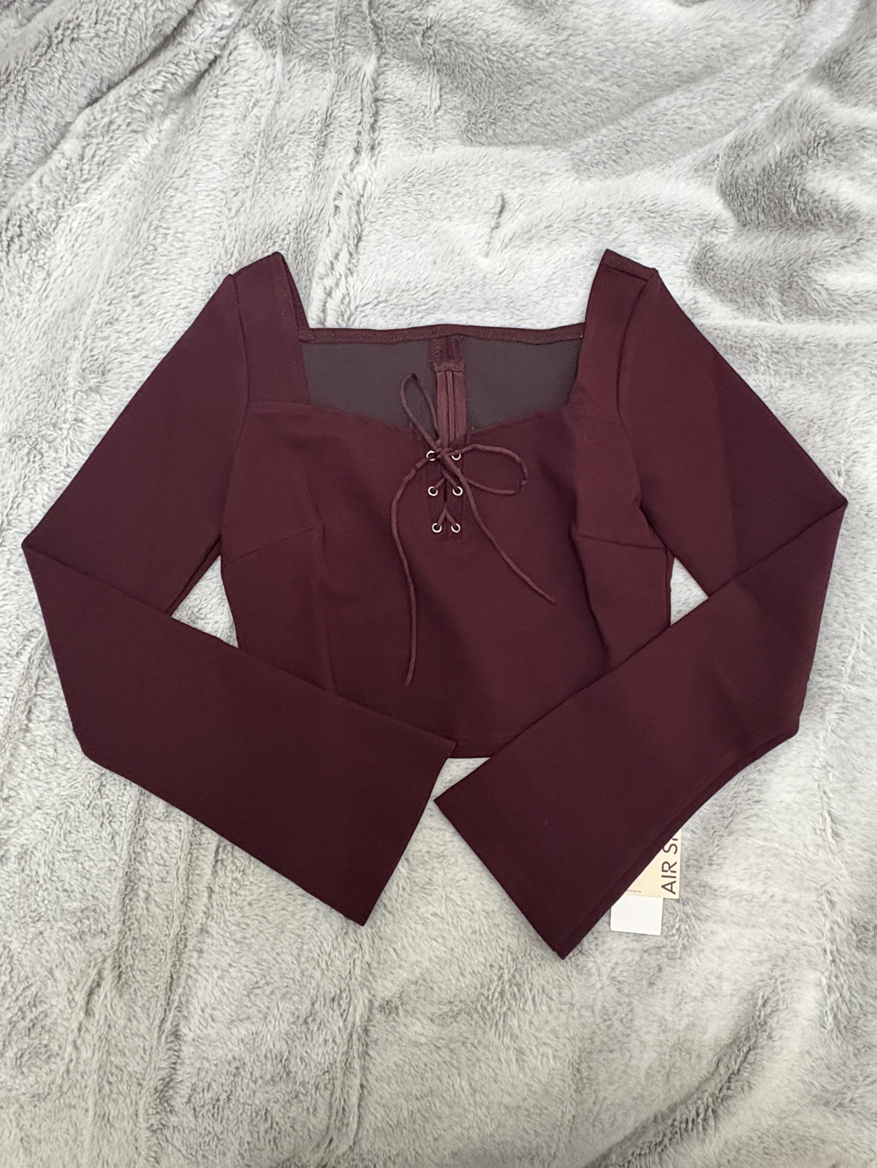 This fitted top is crafted from a stretch fabric that contours smoothly to the body, highlighting feminine curves. The square neckline is paired with a crisscross lace-up detail featuring metal eyelets at the front, subtly refining the neckline while adding a touch of design interest to a classic silhouette. Slightly flared sleeves bring a relaxed, romantic feel, while the cropped length reveals a hint of the waist and visually enhances leg proportions.