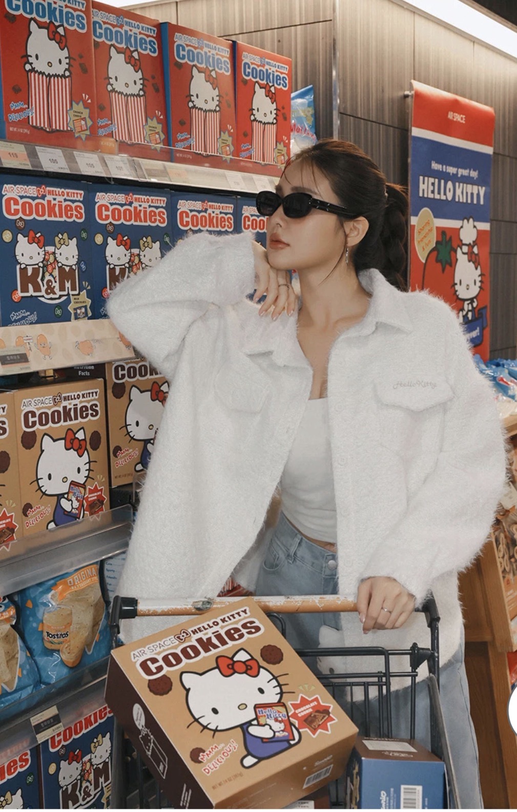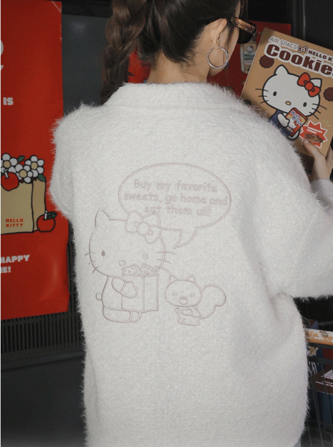 【Hello Kitty Collaboration】Fluffy Oversized Button Down Jacket with Back Kitty Graphic