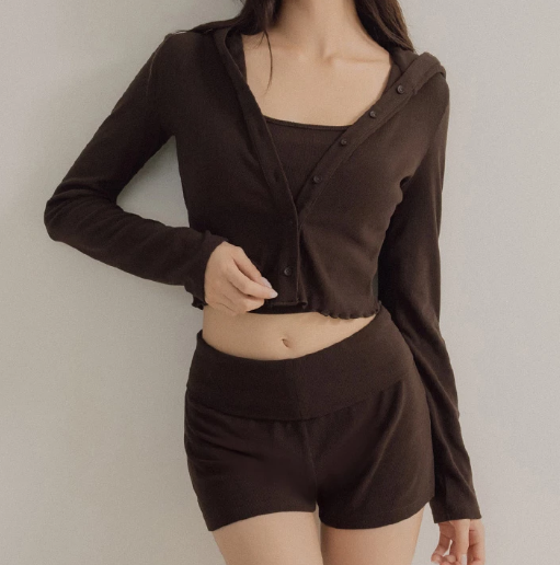 This cropped hooded top features a soft velour-like texture that offers lightweight warmth, paired with a button-front design for versatile, easy styling. The hood adds a casual touch, while the cropped silhouette creates a slimming effect and visually elongates the lower body for a balanced, modern look.