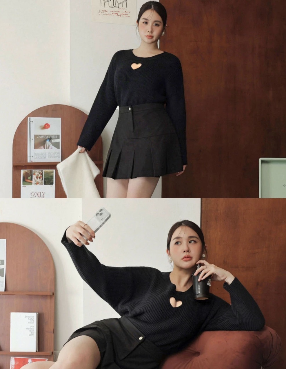 This cropped knit top features a heart-shaped cut-out at the chest, adding a playful focal point that softens the classic round neckline. The cropped length naturally enhances body proportions, while the relaxed dropped-shoulder sleeves offer an easy, comfortable fit—perfect for sweet yet confident everyday styling.