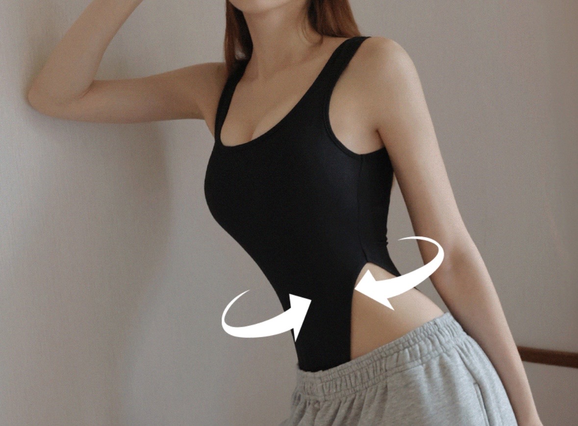 The square neckline with wide straps flatters the face and collarbones. The stretchy fabric with light shaping effect and high-slit design hugs the body comfortably while highlighting a slimmer waist. Pair with jeans or low-rise bottoms for a bold, sexy look.