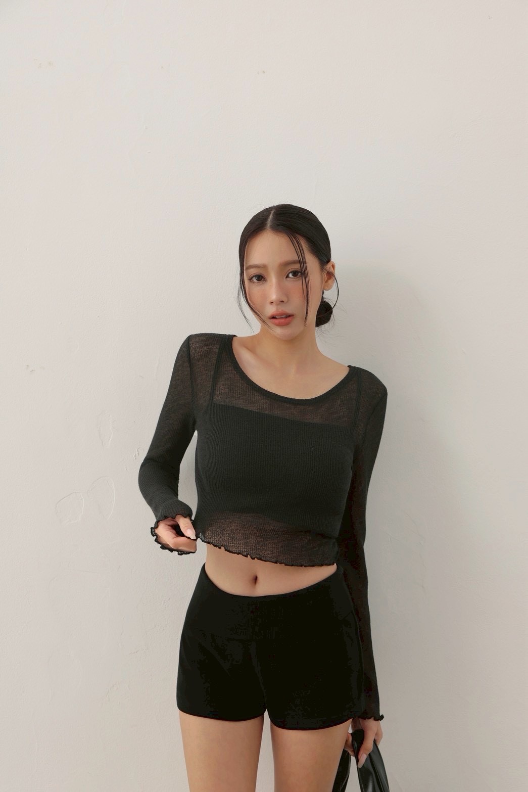 The slimming ribbed fabric combined with a comfortable round neckline shapes an alluring silhouette through a fitted cropped design. The sleeves and hem are adorned with cute lettuce edges, adding sweetness to the simple long-sleeve style. The lightweight material can be worn alone or layered for playful styling.
