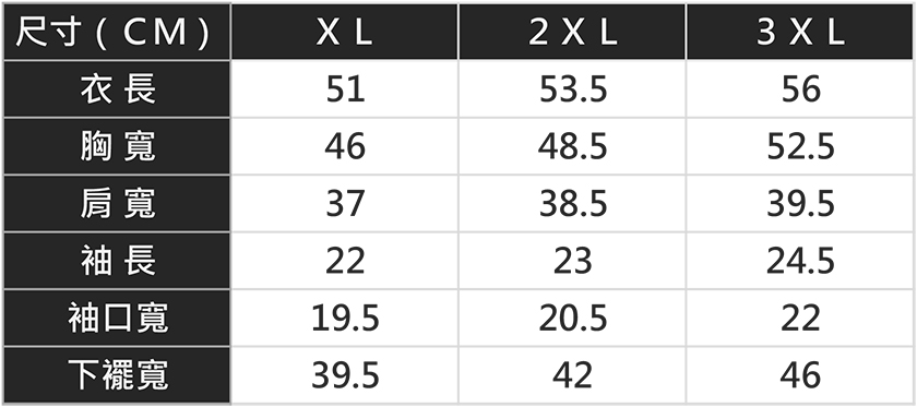 | 版型 | 貼身 | 1 | 2 | 3 | 4 | 5 | 寬鬆 |