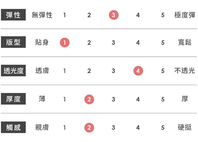 | 觸感 | 親膚 | 1 | 2 | 3 | 4 | 5 | 硬挺 |