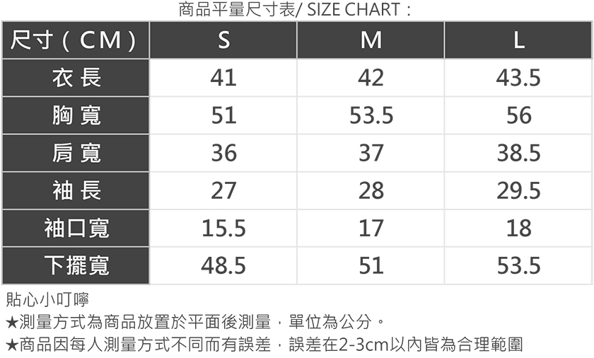 | 版型 | 貼身 | 1 | 2 | 3 | 4 | 5 | 寬鬆 |