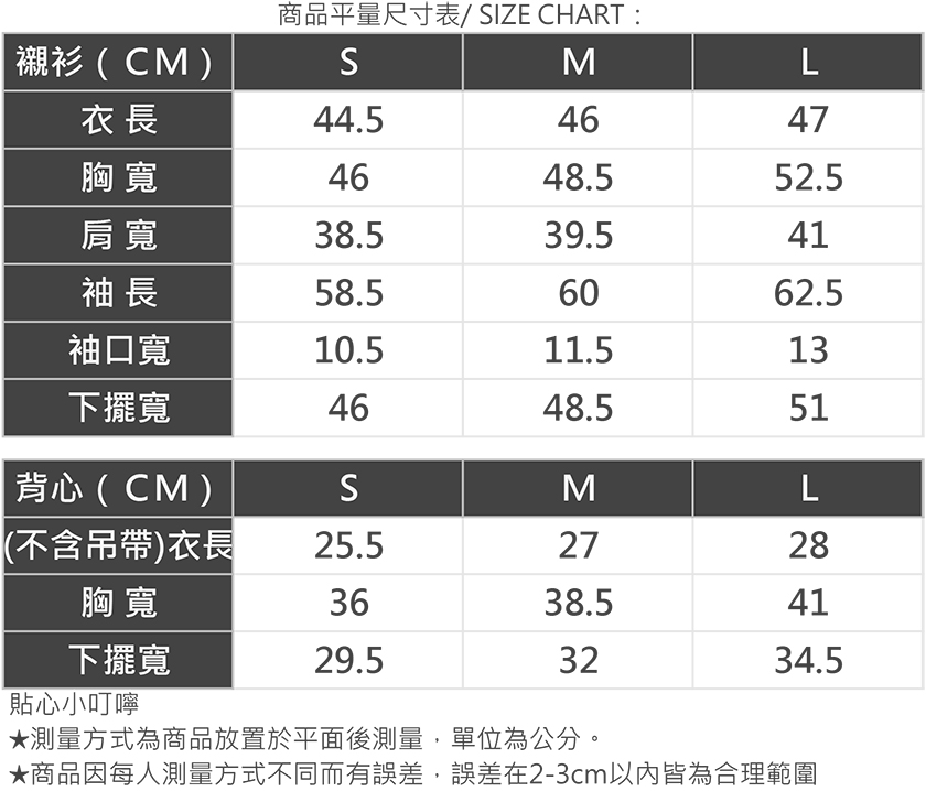 不確定自己的尺寸嗎?別擔心,我們幫你搞定。你可以參考下方商品評量尺寸表或是身材測量方式找到最適合你的尺碼,如果還有疑問也歡迎隨時聯繫我們的客服團隊。