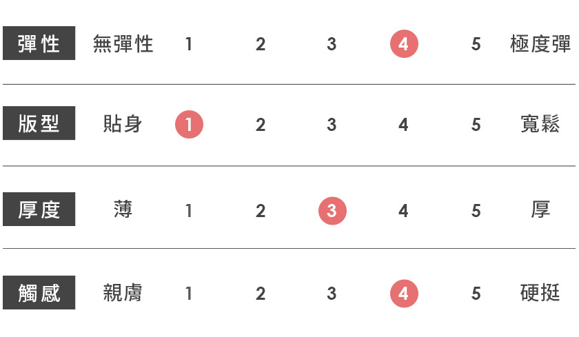 | 觸感 | 親膚 | 1 | 2 | 3 | 4 | 5 | 硬挺 |