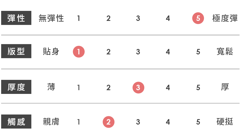 | 觸感 | 親膚 | 1 | 2 | 3 | 4 | 5 | 硬挺 |