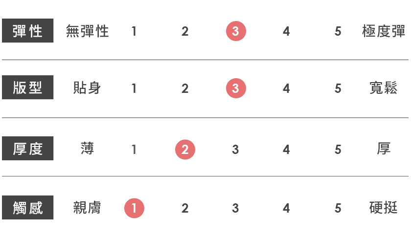 | 觸感 | 親膚 | 1 | 2 | 3 | 4 | 5 | 硬挺 |
