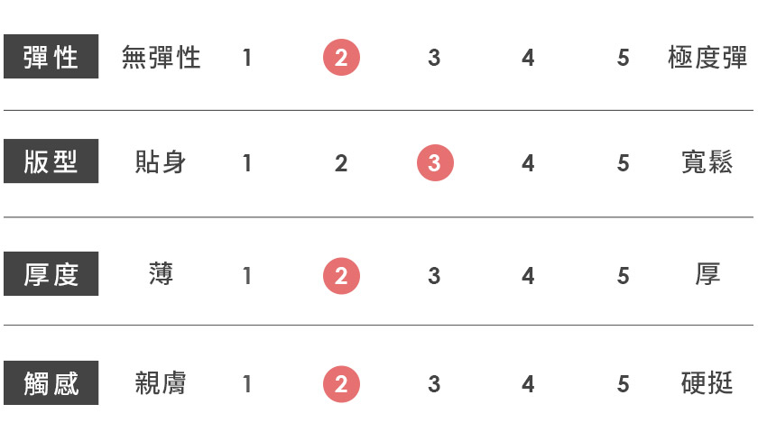 | 觸感 | 親膚 | 1 | 2 | 3 | 4 | 5 | 硬挺 |