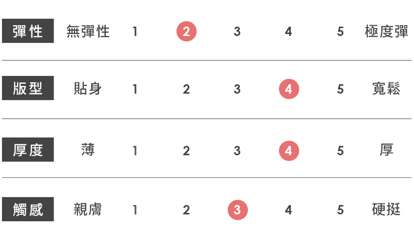 觸感 | 親膚 | 1 | 2 | 3 | 4 | 5 | 硬挺 |