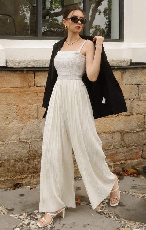 2 Way Tweed Pleated Wide Leg Jumpsuit with Removable Straps