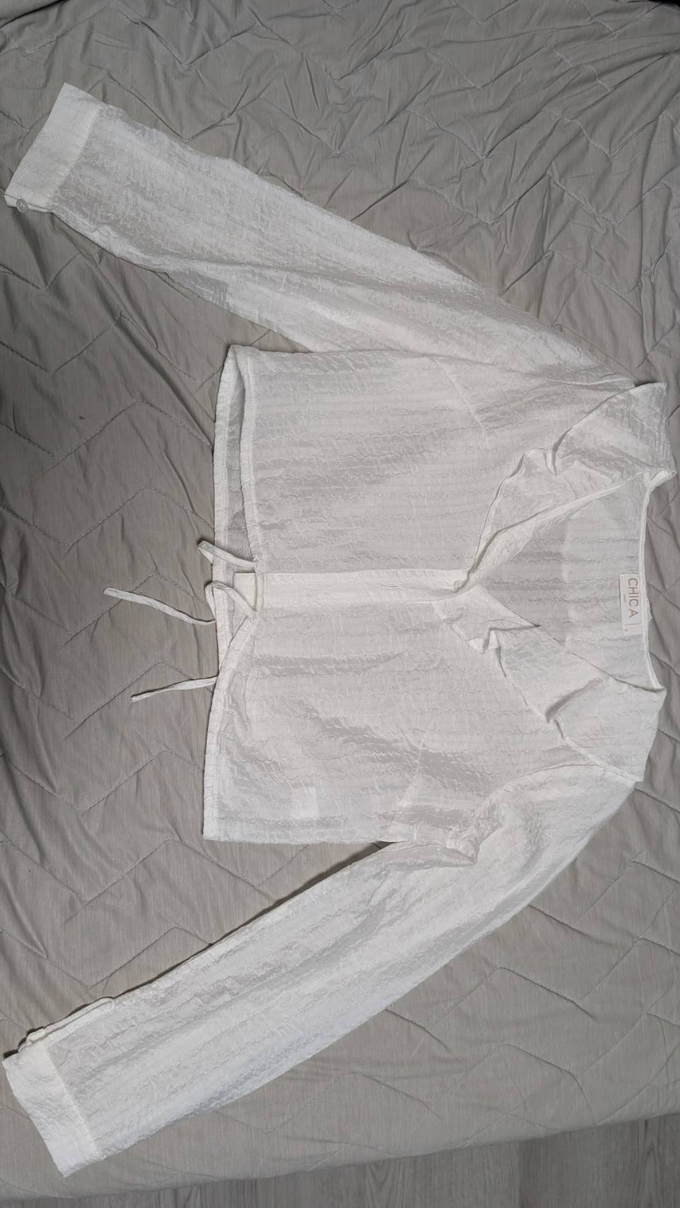 整件質感比教還好,雖織紋跟刺繡細節很精緻,但是因為比較薄。所以荷葉 V 很容易翹起來或是亂有折痕。材質親膚不刺,搭高腰褲/裙很顯比例,約會或上班都能穿。