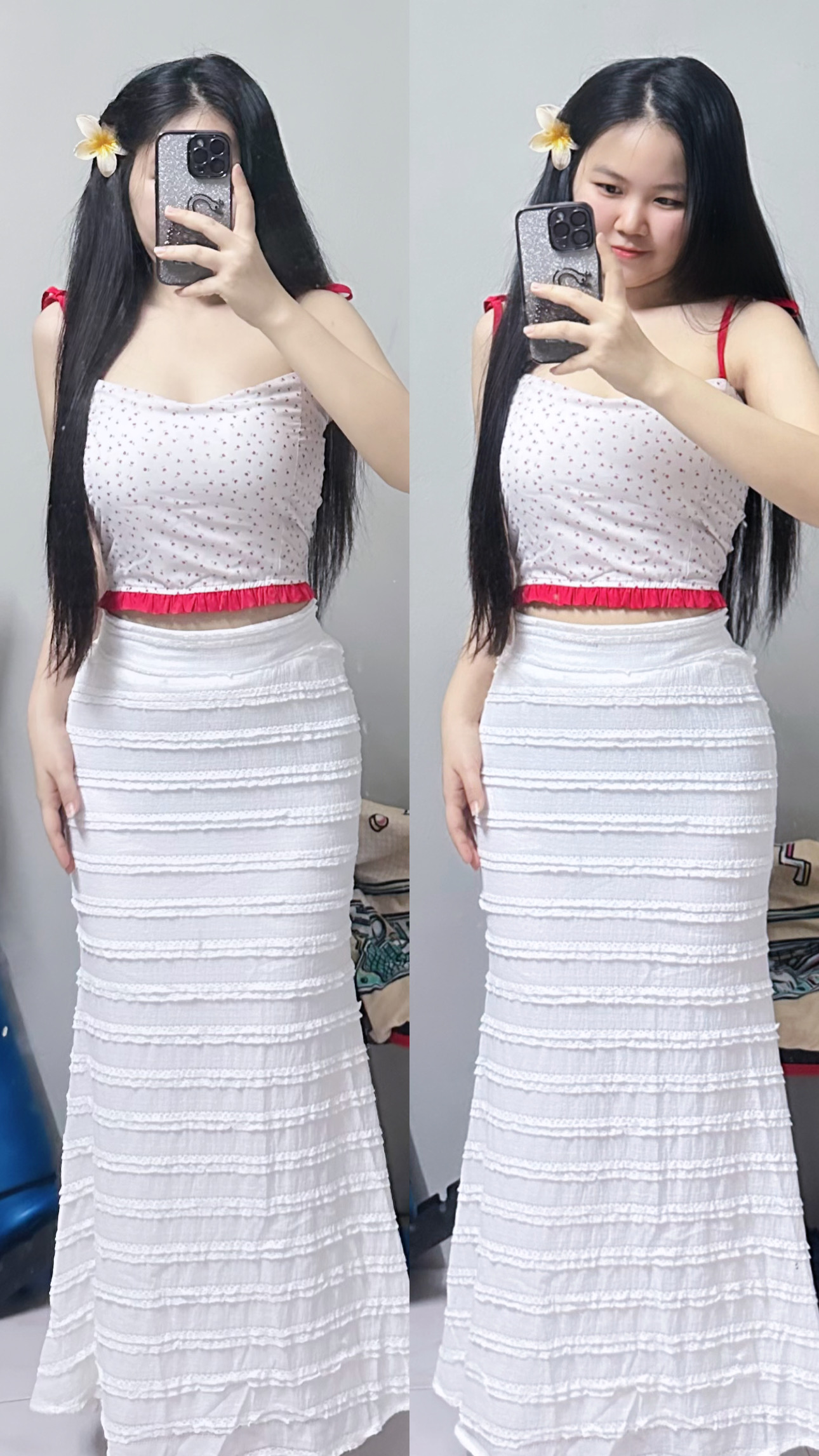 Product Description: Comes with removable bra pads / Detachable tie shoulder straps / Ruffled hem design / Back shirring with elastic