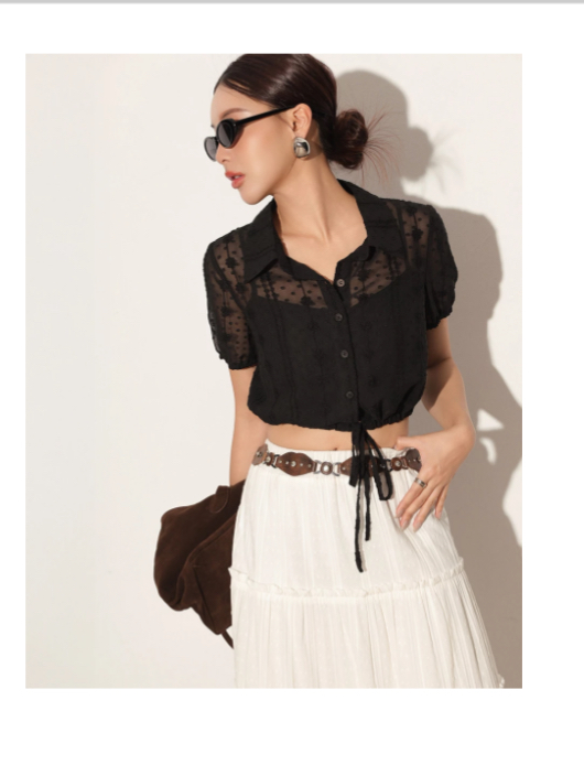 Faux 2 Piece Dot Pattern Floral Lace Embroidered Puff Sleeve Crop Shirt with Drawstring Hem