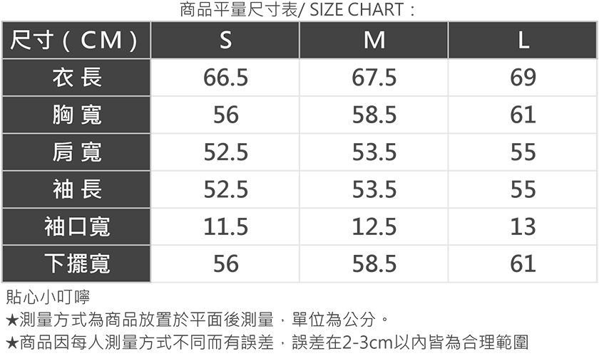 | 版型 | 貼身 | 1 | 2 | 3 | 4 | 5 | 寬鬆 |