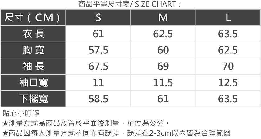 | 版型 | 貼身 | 1 | 2 | 3 | 4 | 5 | 寬鬆 |