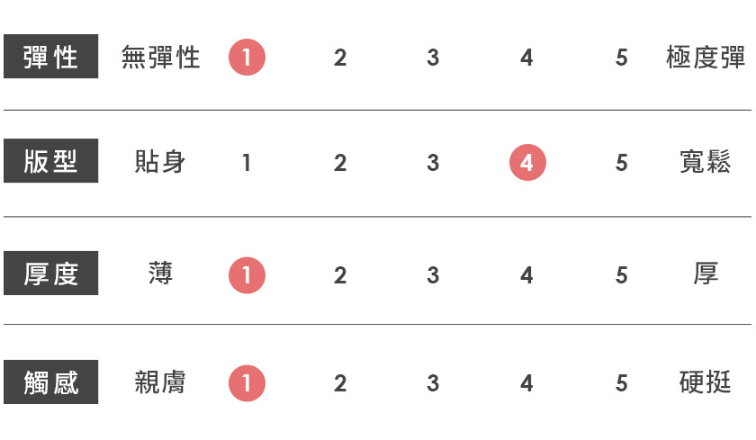 | 觸感 | 親膚 | 1 | 2 | 3 | 4 | 5 | 硬挺 |