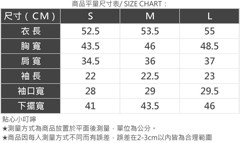 | 版型 | 貼身 | 1 | 2 | 3 | 4 | 5 | 寬鬆 |