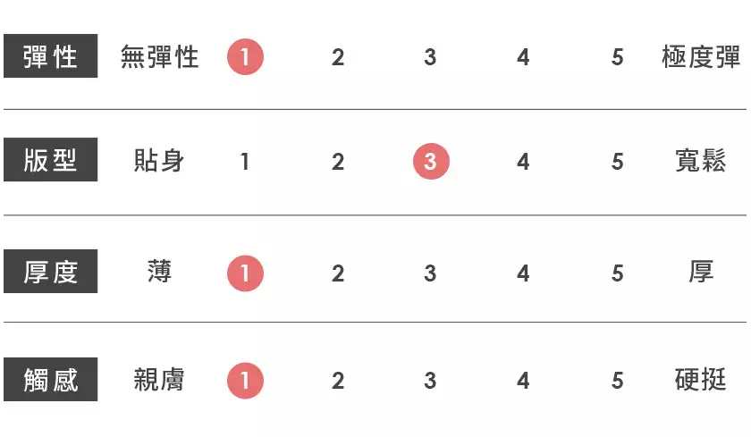 | 觸感 | 親膚 | 1 | 2 | 3 | 4 | 5 | 硬挺 |