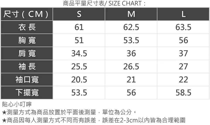 | 版型 | 貼身 | 1 | 2 | 3 | 4 | 5 | 寬鬆 |