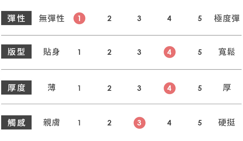 | 觸感 | 親膚 | 1 | 2 | 3 | 4 | 5 | 硬挺 |