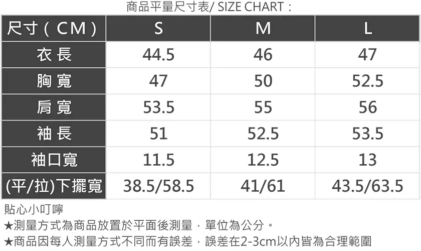 | 版型 | 貼身 | 1 | 2 | 3 | 4 | 5 | 寬鬆 |