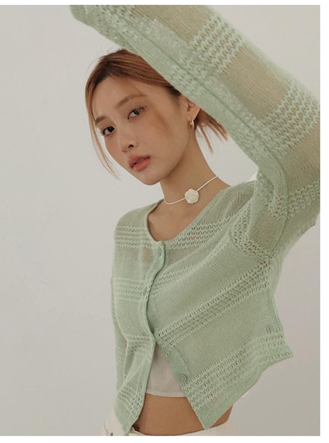 Crew Neck Border Mesh Knit Long Sleeve Cardigan