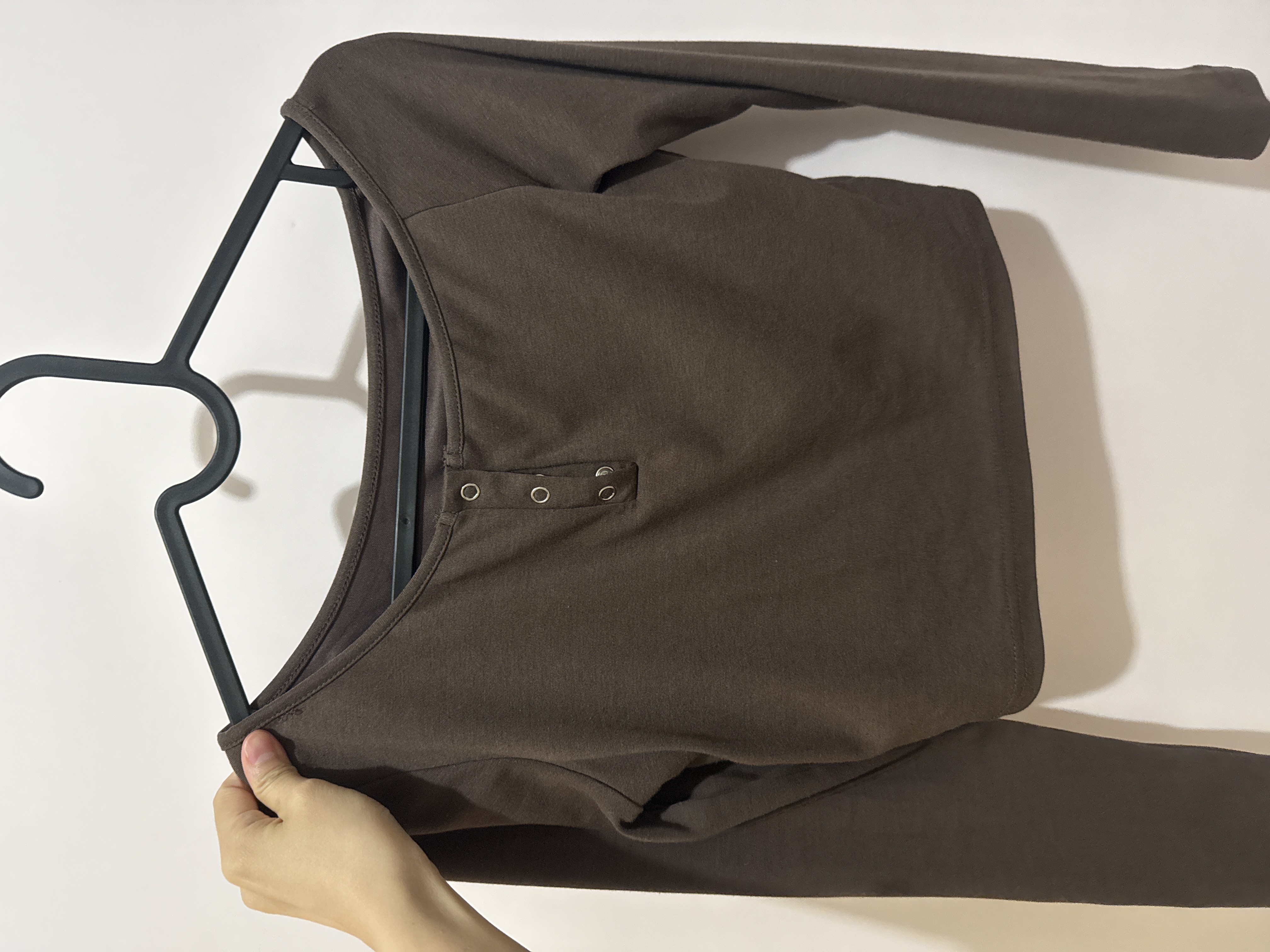 This asymmetrical long-sleeve bra top features a sleek neckline that highlights the collarbone, paired with an adjustable snap-button placket for a refined, modern look. The body-hugging fit creates clean upper-body lines, while the built-in removable bra padding provides stable support and all-day comfort, making it a subtle yet confident statement piece for everyday styling.