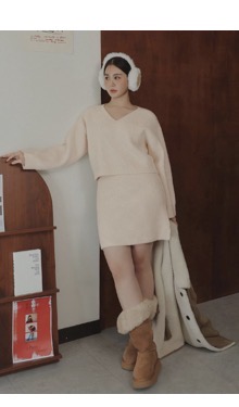 This V-neck knit set highlights the face with a flattering neckline and a cropped top that subtly reveals the waist, adding a confident winter allure. Paired with a fitted knit skirt, it smooths and defines the lower-body silhouette for a refined finish. When you’re unsure what to wear, this coordinated set makes it easy to achieve a polished, put-together look in one step.