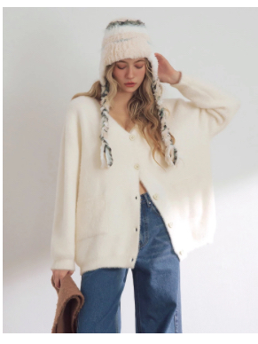 This V-neck faux-fur knit cardigan features heart-shaped button details that add a charming accent to its relaxed, cozy silhouette. The fluffy, skin-friendly texture feels soft without irritation, while the longline cut and dropped shoulders create an effortlessly laid-back look with a touch of sweetness.