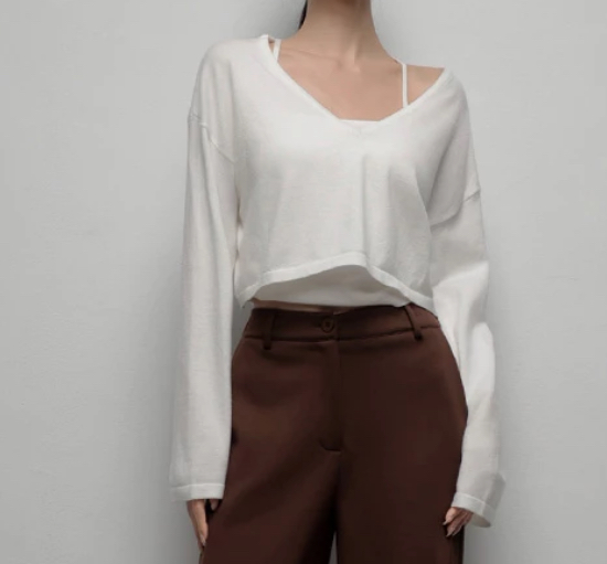 2WAY Knit V Neck Long Sleeve Top and Spaghetti Strap Camisole Set Wear