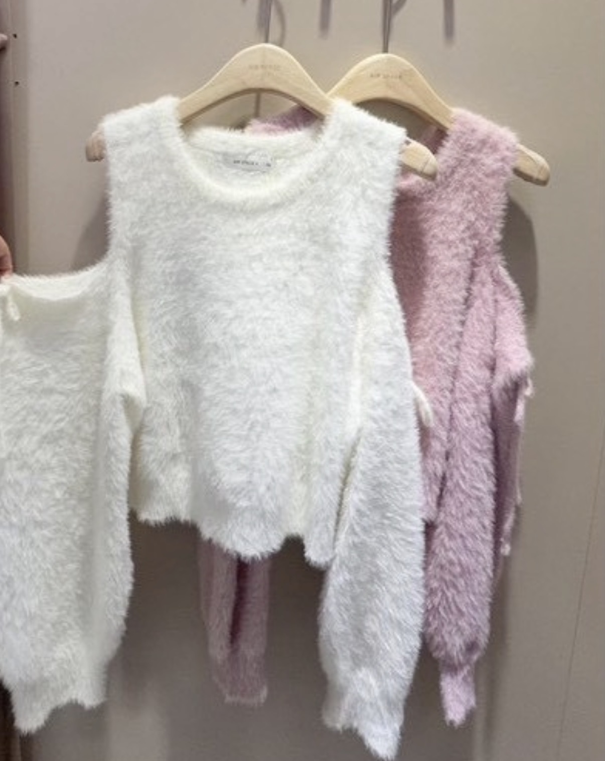 This faux mink knit sweater features a plush, airy texture that feels soft against the skin without irritation. The cropped silhouette delivers a clean, lightweight look that redefines traditional bulky knitwear, while shoulder cut-out details with delicate tie accents introduce a refined touch of subtle sensuality for a modern winter statement.
