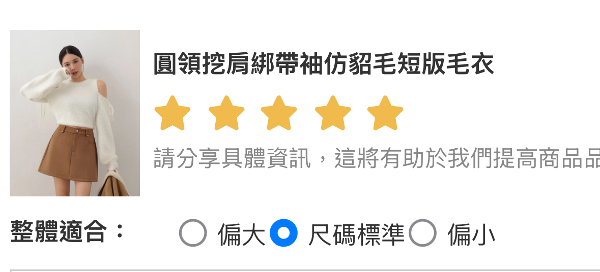 | 版型 | 貼身 | 1 | 2 | 3 | 4 | 5 | 寬鬆 |