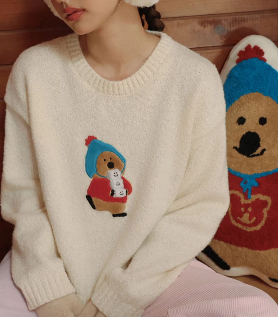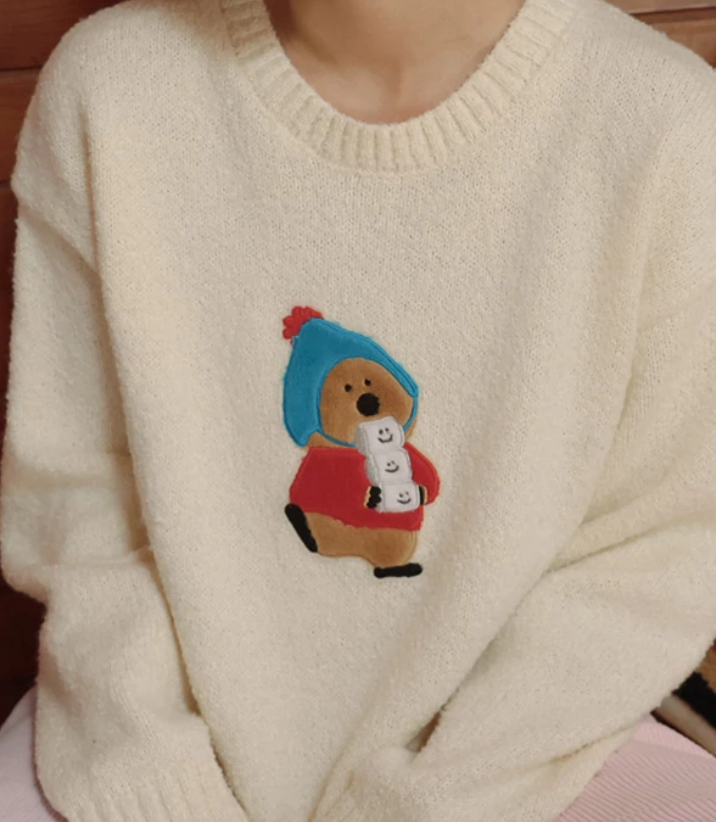 【DINOTAENG】Round Neck Crop Top Knit Sweater With Patch