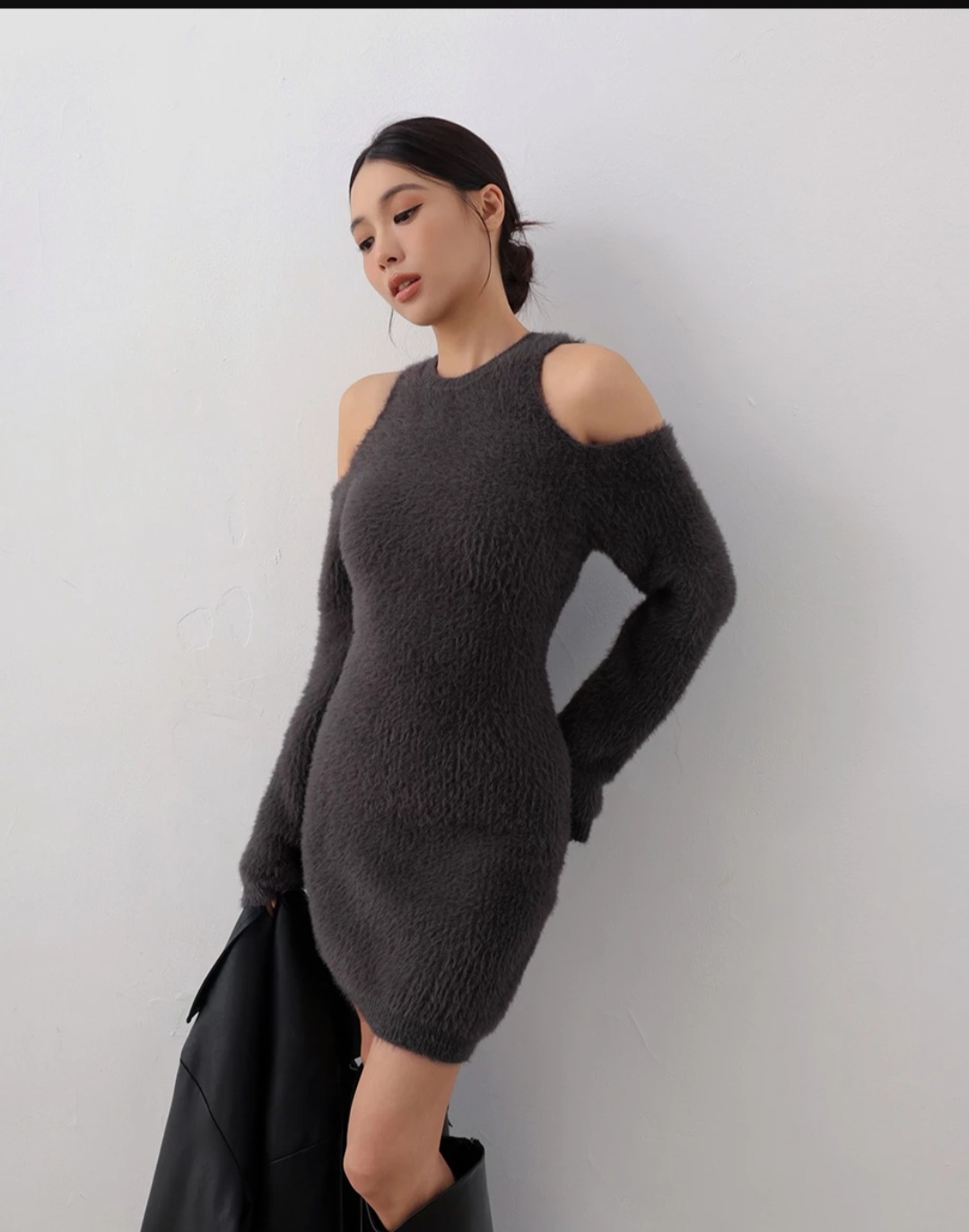 This knitted mini dress features a double cut-out shoulder design that highlights the shoulder line while creating a sweet yet subtly alluring silhouette. The body-hugging yet comfortable fit shapes the figure without restriction, and the mini length enhances leg proportions for a clean, elongated look.