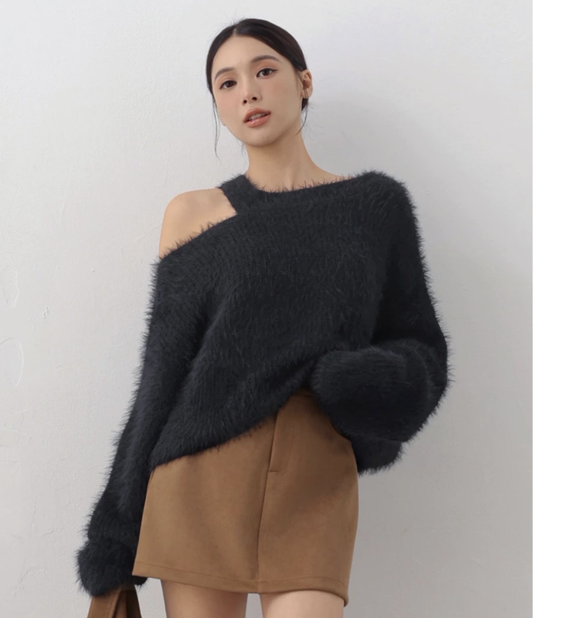 This asymmetrical faux-fur knit sweater features a single-shoulder cut-out detail that adds a subtle touch of allure to its clean, relaxed silhouette. The wide, dropped-shoulder fit offers comfort and a naturally laid-back charm.